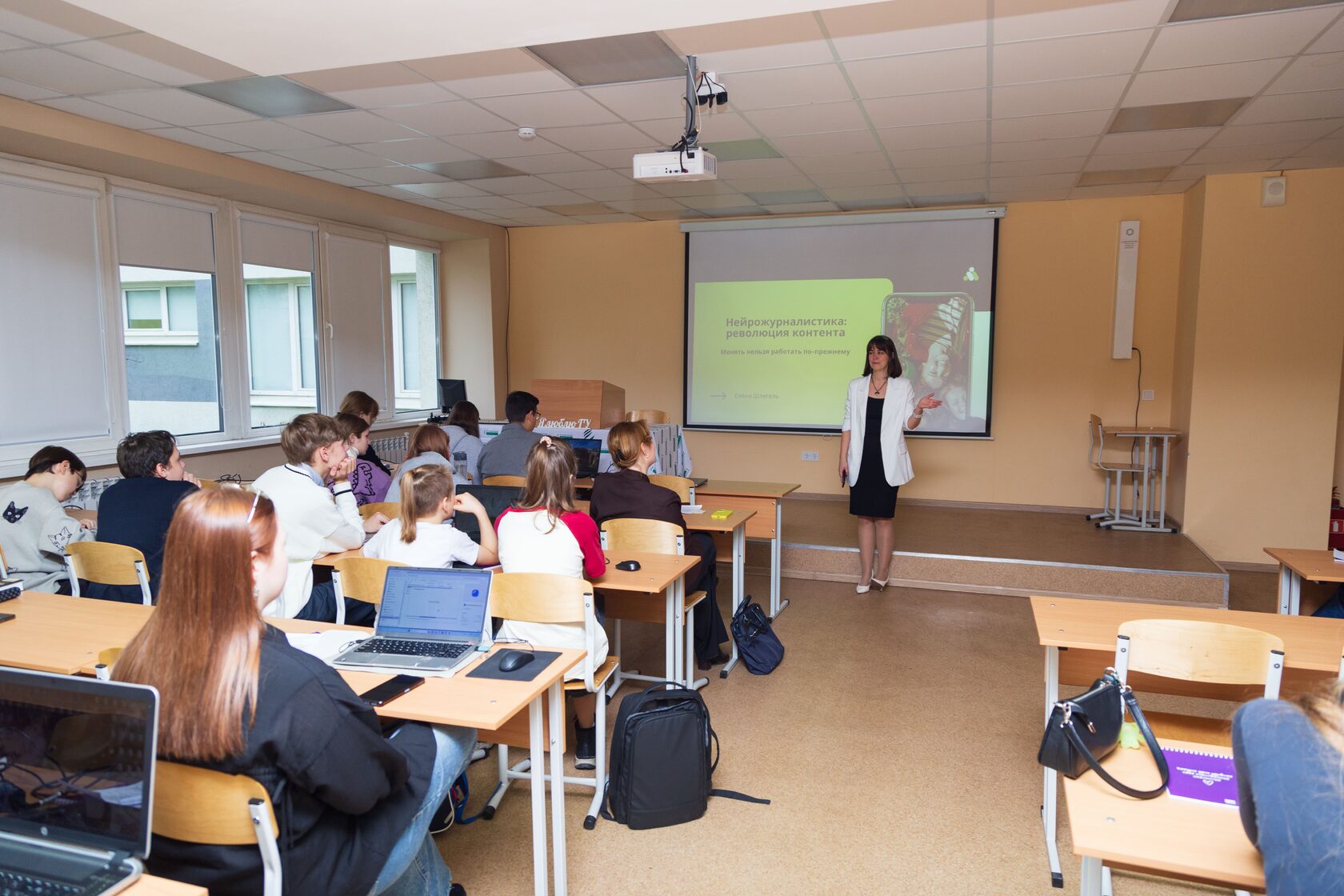 Уже постоянный и любимый нашими юнкорами и педагогами спикер — Елена Владимировна Шлегель, заместитель декана факультета журналистики и медиакоммуникаций — поделилась с участниками знаниями об искусственном интеллекте, который может облегчить и улучшить работу начинающих и опытных медийщиков.